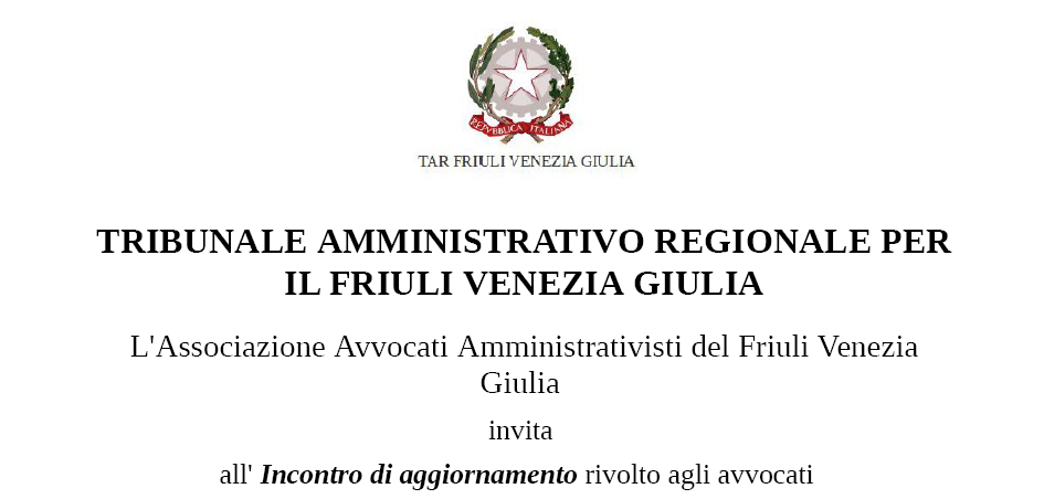 Incontro di aggiornamento rivolto agli avvocati “IL PROCESSO AMMINISTRATIVO TELEMATICO D.L.”PUBBLICA AMMINISTRAZIONE” DEL 12 GIUGNO 2014″ – MARTEDÌ 15 LUGLIO ORE 11:00 – Sala udienze del TAR Friuli Venezia Giulia, Piazza Unità d’Italia, n.7 – Trieste