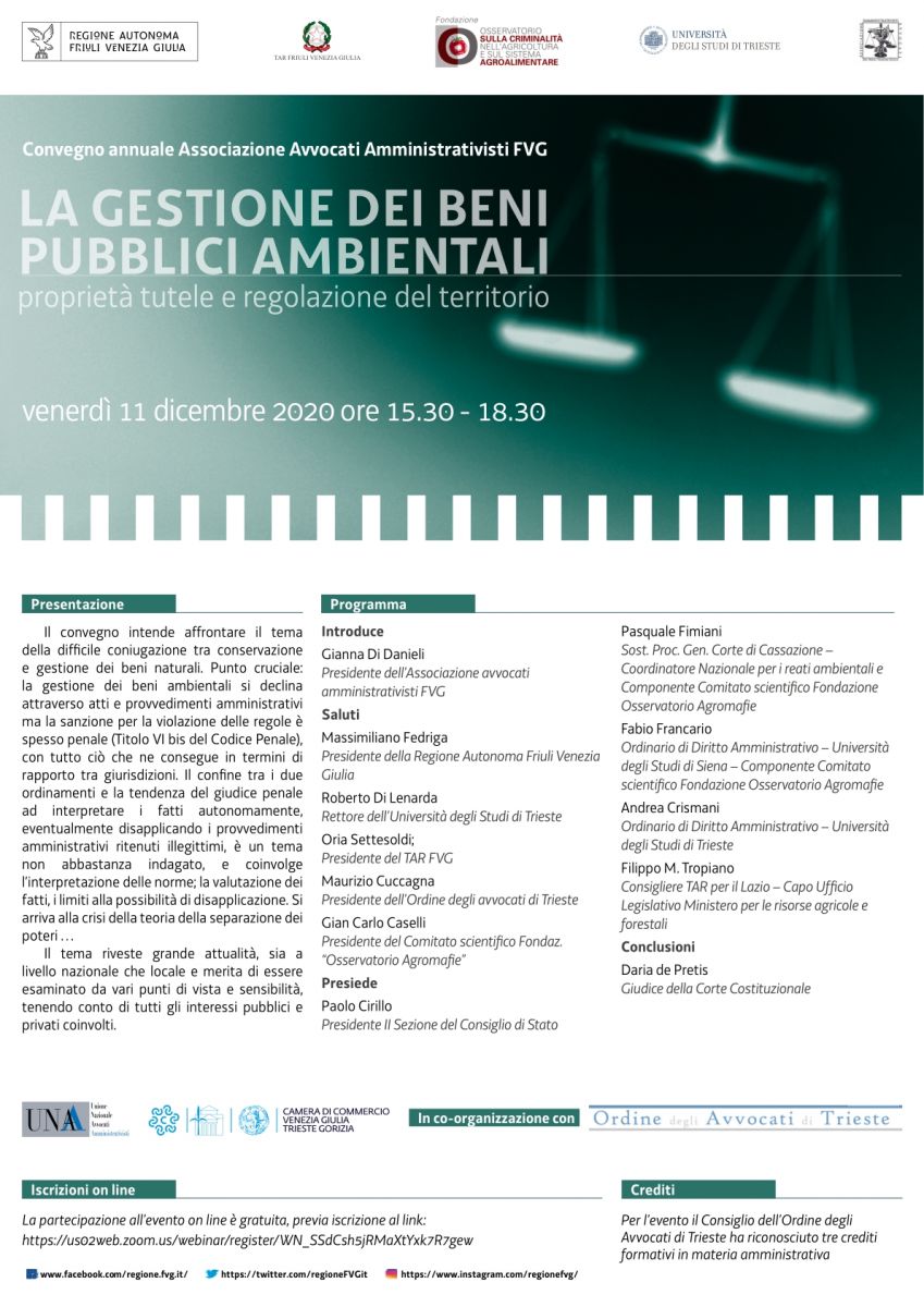 AAttività CONVEGNO ANNUALE ASSOCIAZIONE AVVOCATI AMMINISTRATIVISTI FVG – “LA GESTIONE DEI BENI PUBBLICI AMBIENTALI: proprietà tutele e regolazione del territorio”. Venerdì 11 dicembre 2020 ore 15.30 – 18.30, Webinar su piattaforma ZOOM. 04/12/2020 0 Shares 0 0 0 0 La partecipazione all’evento on line è gratuita, previa iscrizione al link: https://us02web.zoom.us/webinar/register/WN_SSdCsh5jRMaXtYxk7R7gew 0 Shares: Share 0 Tweet 0 Pin it 0