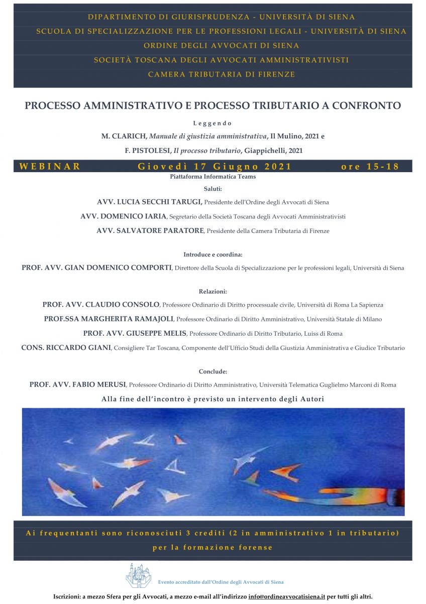 AAttività WEBINAR – “PROCESSO AMMINISTRATIVO E PROCESSO TRIBUTARIO A CONFRONTO”. Giovedì 17 giugno, ore 15. Piattaforma Microsoft Teams 20/05/2021 0 Shares 0 0 0 0 0 Shares: Share 0 Tweet 0 Pin it 0